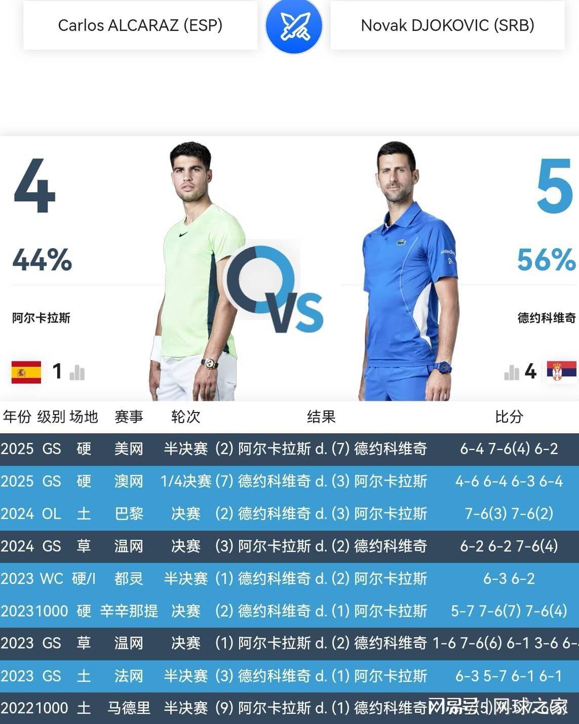 职业生涯至今,阿尔卡拉斯和德约科维奇交锋九次,四胜五负落后对手,不过大满贯赛场,两人交锋五次,阿尔卡拉斯三胜两负领先对手。2023、2024年温网决赛,阿尔卡拉斯以初生牛犊不怕虎的冲劲,竟然连续两年将七届温网冠军德约科维奇掀翻在地,笑傲温布尔登。